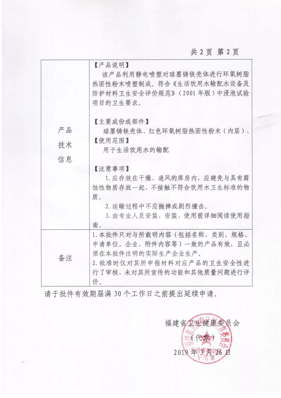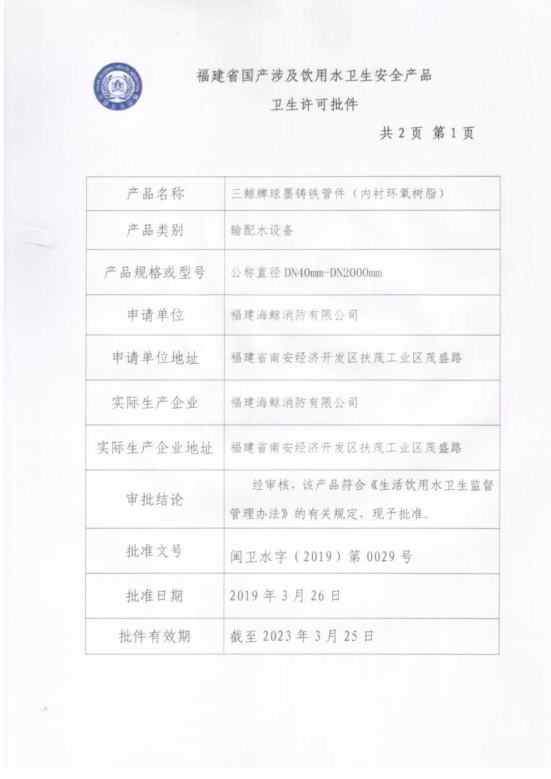 海鯨消防于2019年3月獲得《福建省國(guó)產(chǎn)涉及飲用水衛(wèi)生安全產(chǎn)品衛(wèi)生許可批件》。