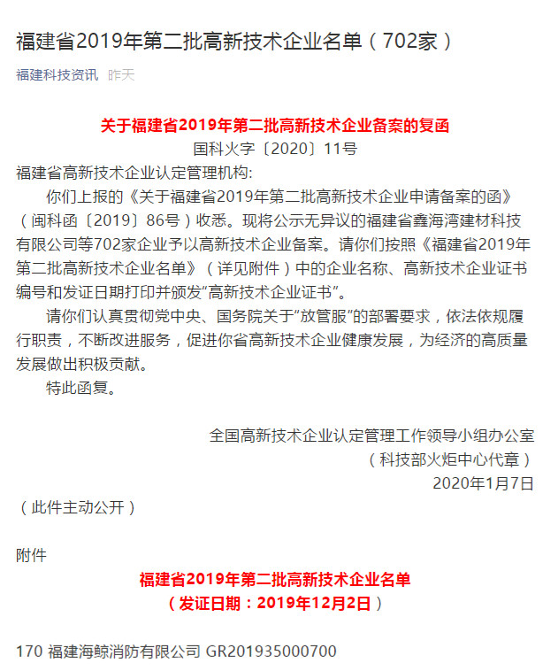 2020年1月7日,國家高新技術(shù)企業(yè)認(rèn)定工作網(wǎng)上公布了福建省2019年第二批擬認(rèn)定高新技術(shù)企業(yè)名單,福建海鯨消防有限公司順利通過2019年高新技術(shù)企業(yè)審核。
