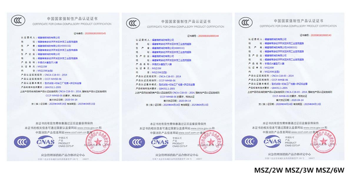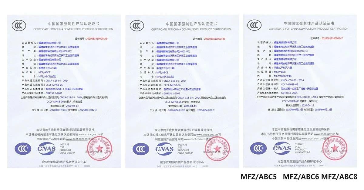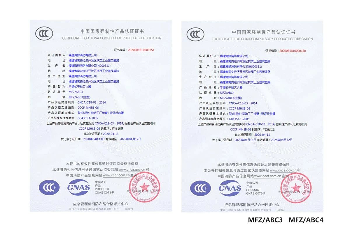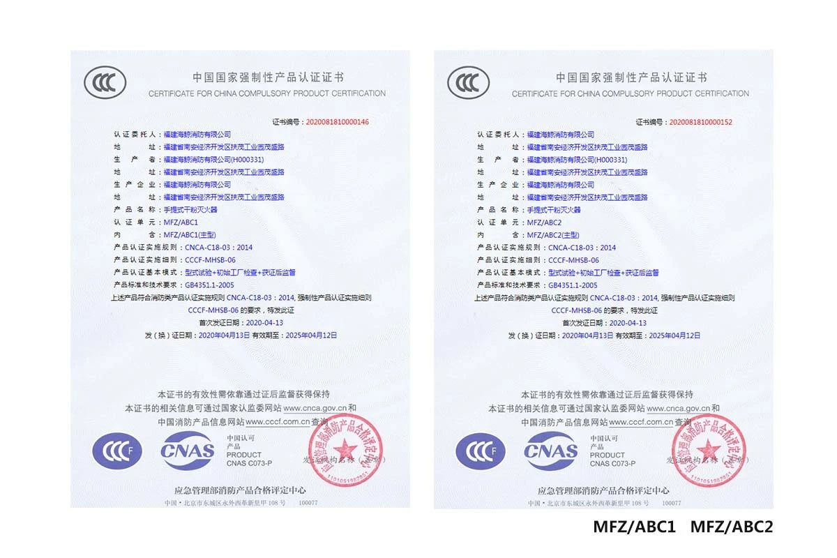 2020年4月13日福建海鯨消防有限公司取得手提式干粉滅火器/手提式水基型滅火器《中國國家強(qiáng)制性產(chǎn)品認(rèn)證證書》。