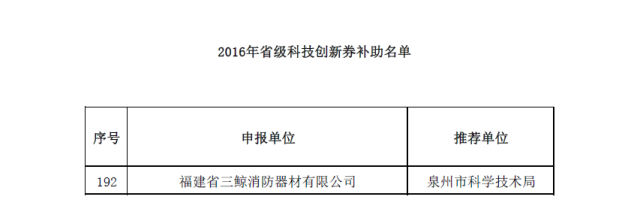 Recently, the Office of Science and Technology of Fujian Province issued a notice on the 2016 Science and Technology Innovation Ticket notice list, announced in Fujian Province, three whale Fire Equipment Co., Ltd. Fujian Science and Technology Innovation Award 2016 project subsidy.